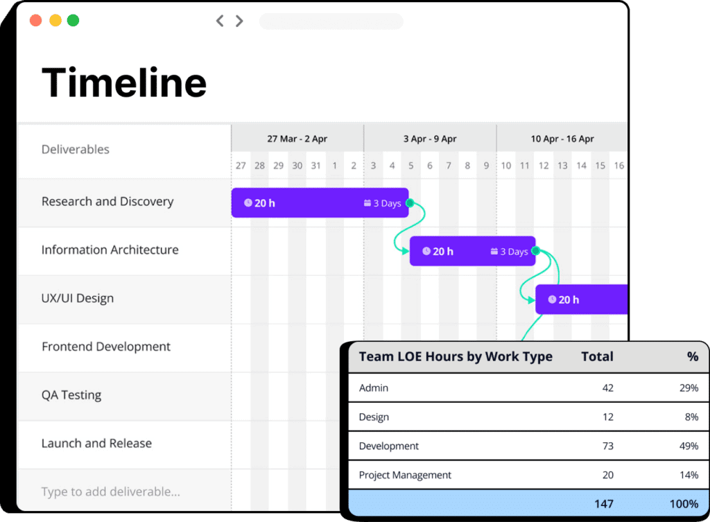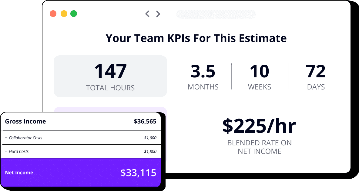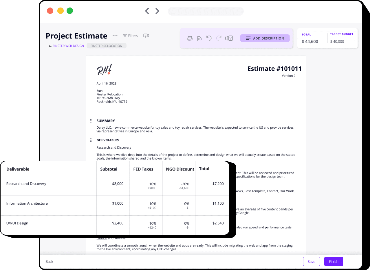 Creating and managing estimates can often be a time-consuming task. With Net Net, you can generate accurate estimates quickly and manage them with ease. In a few simple steps you’ll input the Level of Effort (LOE) for each deliverable and task, timeline, pricing information and voila, your estimate is ready to go. With Reusable deliverable templates, you can build your estimates even faster, Want to streamline your estimating process?